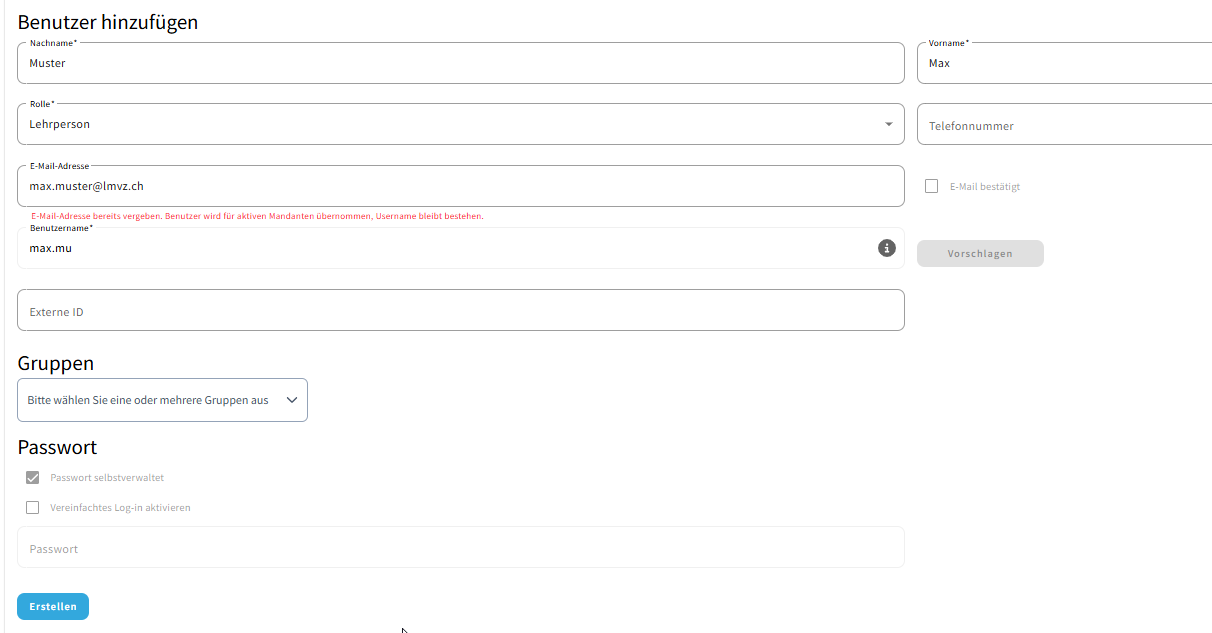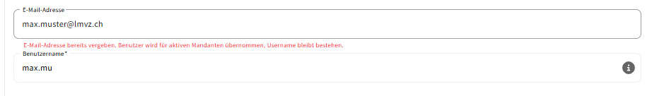 Das System erkennt automatisch, wenn die E-Mail-Adresse bereits existiert, und ergänzt den bestehenden Benutzernamen.