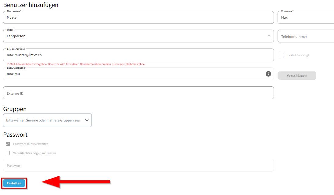 Das System erkennt automatisch, wenn die E-Mail-Adresse bereits existiert, und ergänzt den bestehenden Benutzernamen.