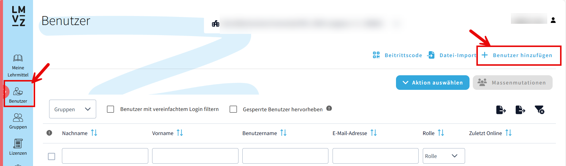 Loggen Sie sich auf digital.lmvz.ch in das System ein. Klicken Sie in der Navigation auf Benutzer und anschliessend auf + Benutzer hinzufügen.